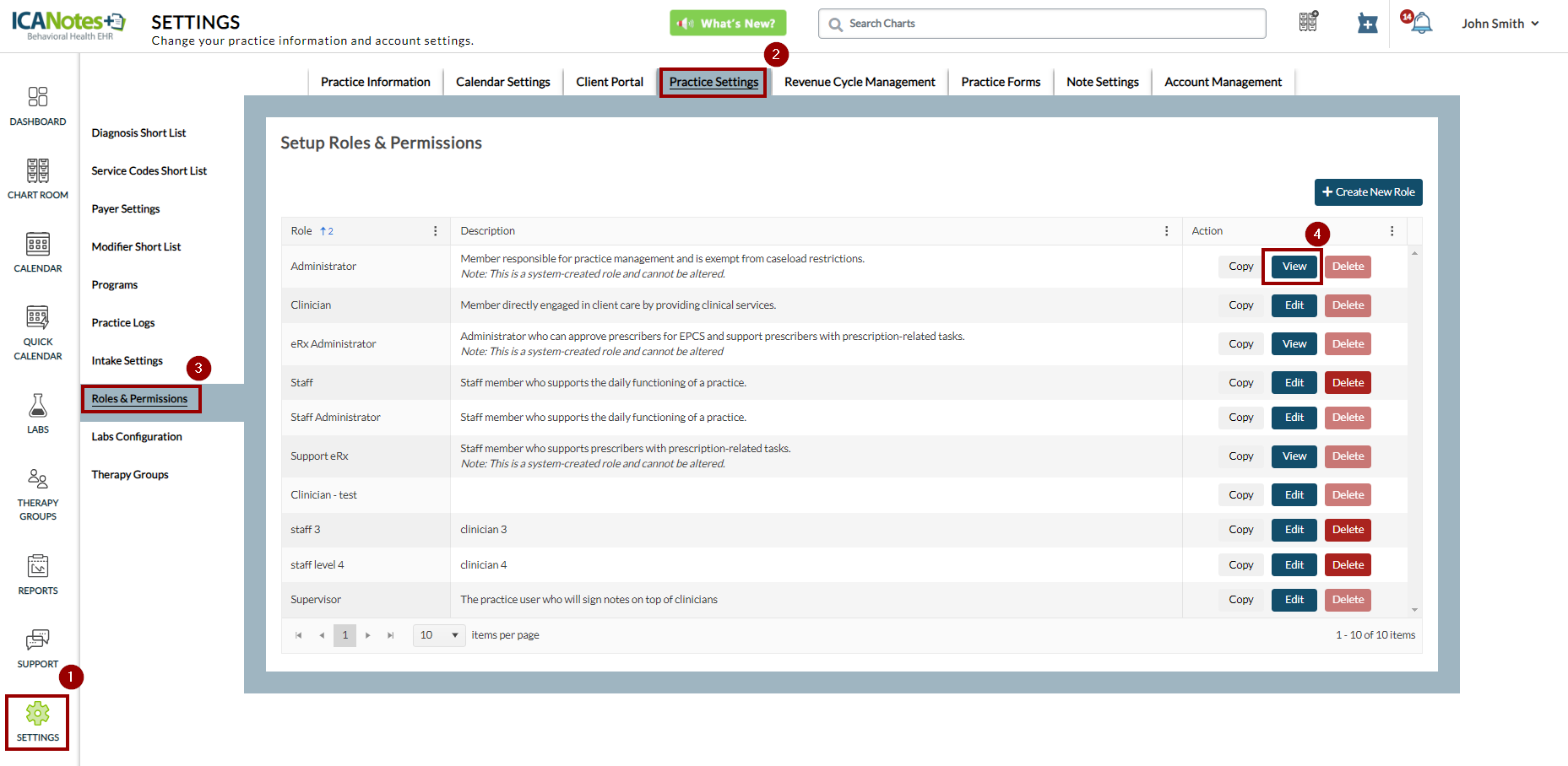 To grant permission for viewing co-signature requests sent to other clinicians, navigate to Settings > Practice Settings > Roles & Permissions.