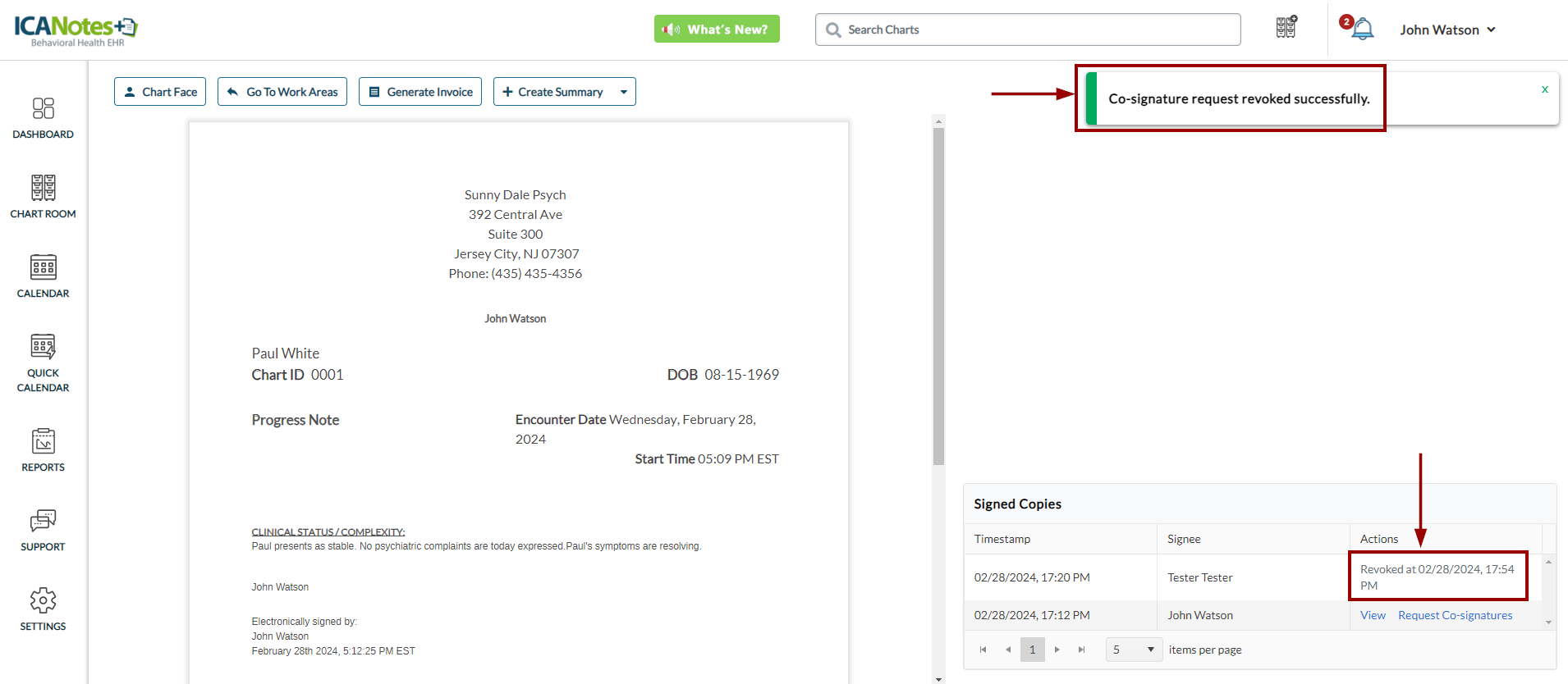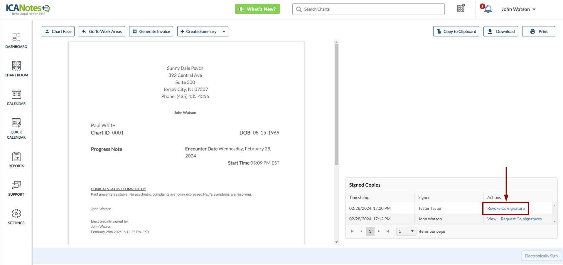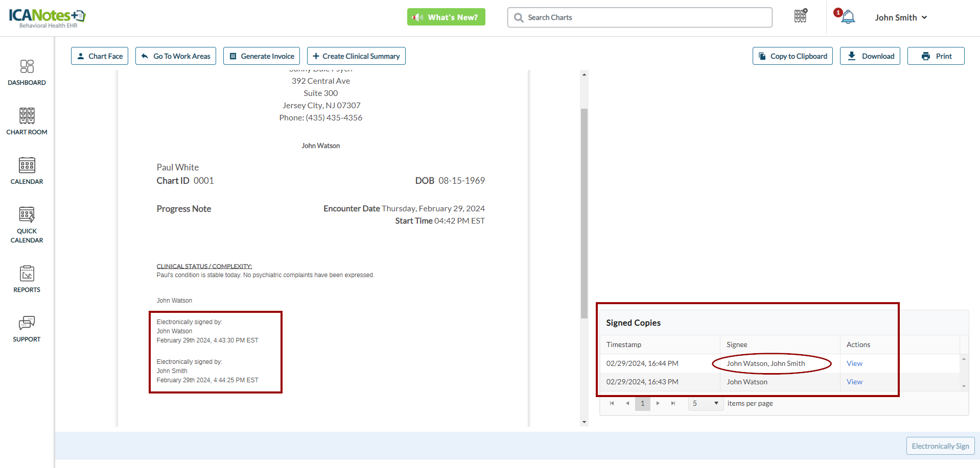 After the co-signers capture the signature, the provider can review all signatures on the note along with timestamps, as demonstrated in the screen below: