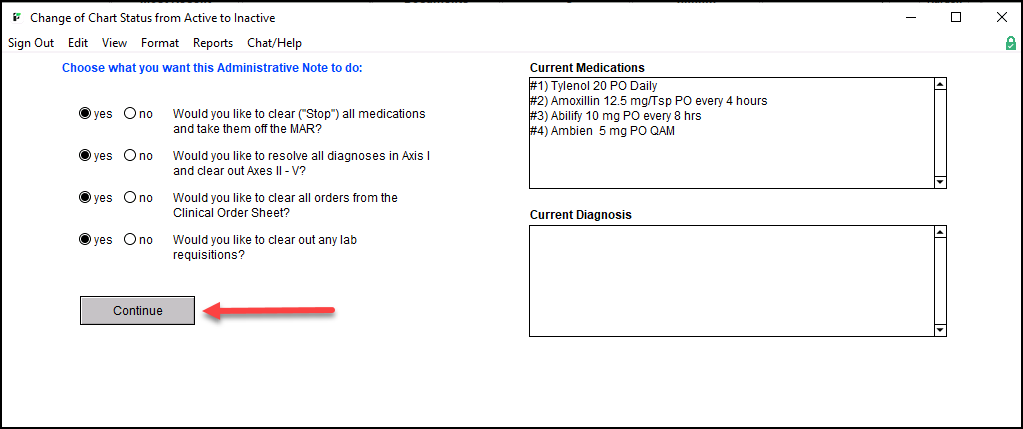 4. The next dialog presents the various things you can clear out to prepare the Chart for the next admission. Once you choose the desired options, click 'Continue' to create the Administrative Note.