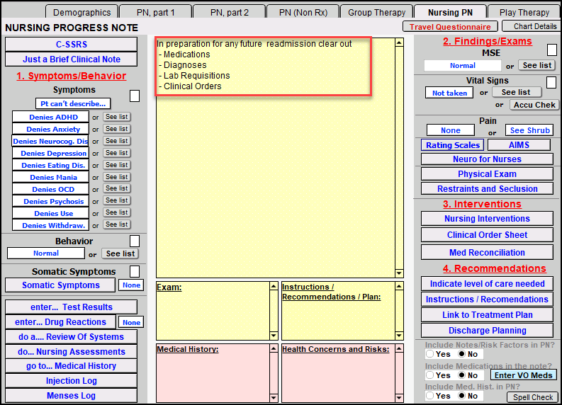 5. You will be directed to the Work Areas of the Administrative Note, which is essentially the Nursing Note layout. Text will auto-populate indicating the actions you took in the previous dialog.