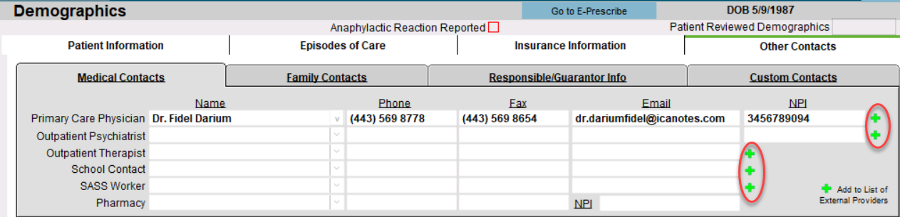 Alternatively, you can add a provider from the Other Contacts tab in Patient Demographics. If you fill in the area and want to send the contact to your External Provider List, you would complete the information that you have and then use the icon to add the contact.