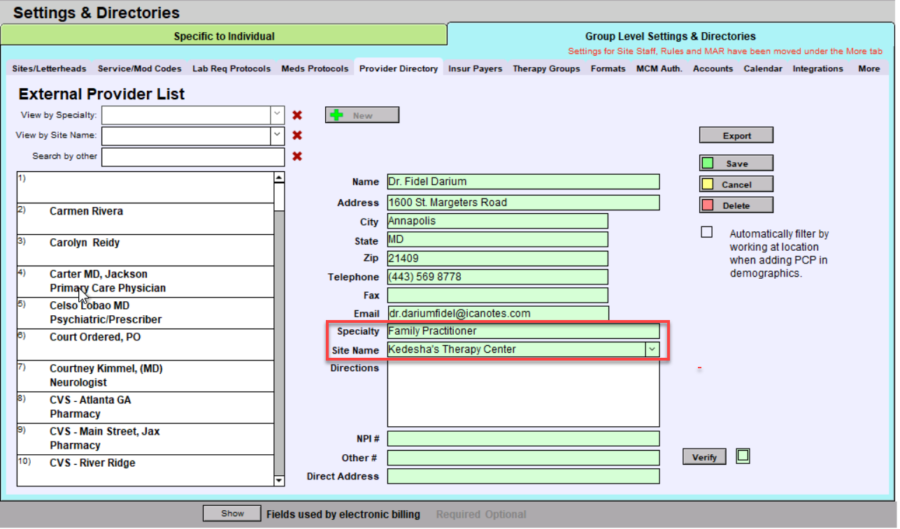 When adding a new entry, feel free to select or create a "Specialty" and "Site Name." Specialty will allow you to view the contacts in groups (i.e., "Pharmacies"), making the data easier to navigate. Specifying a Site Name will allow you to sort external providers by proximity to the chosen site. This may help larger user groups who have practices in multiple, distant locations.