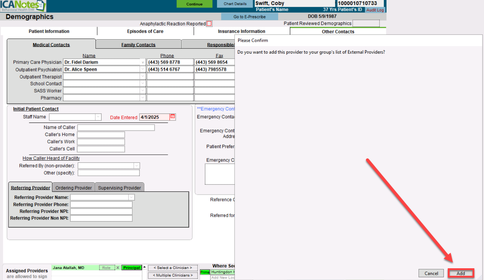 As an example, you can see that contact information was complete for Outpatient Psychiatrist Dr. Alice Speen, and then the green icon was clicked in order to add this provider to the group's list of External Providers. The 'Please Confirm' popup window then populates, asking you to 'Add' or 'Cancel' adding this provider to your group's External Provider List.