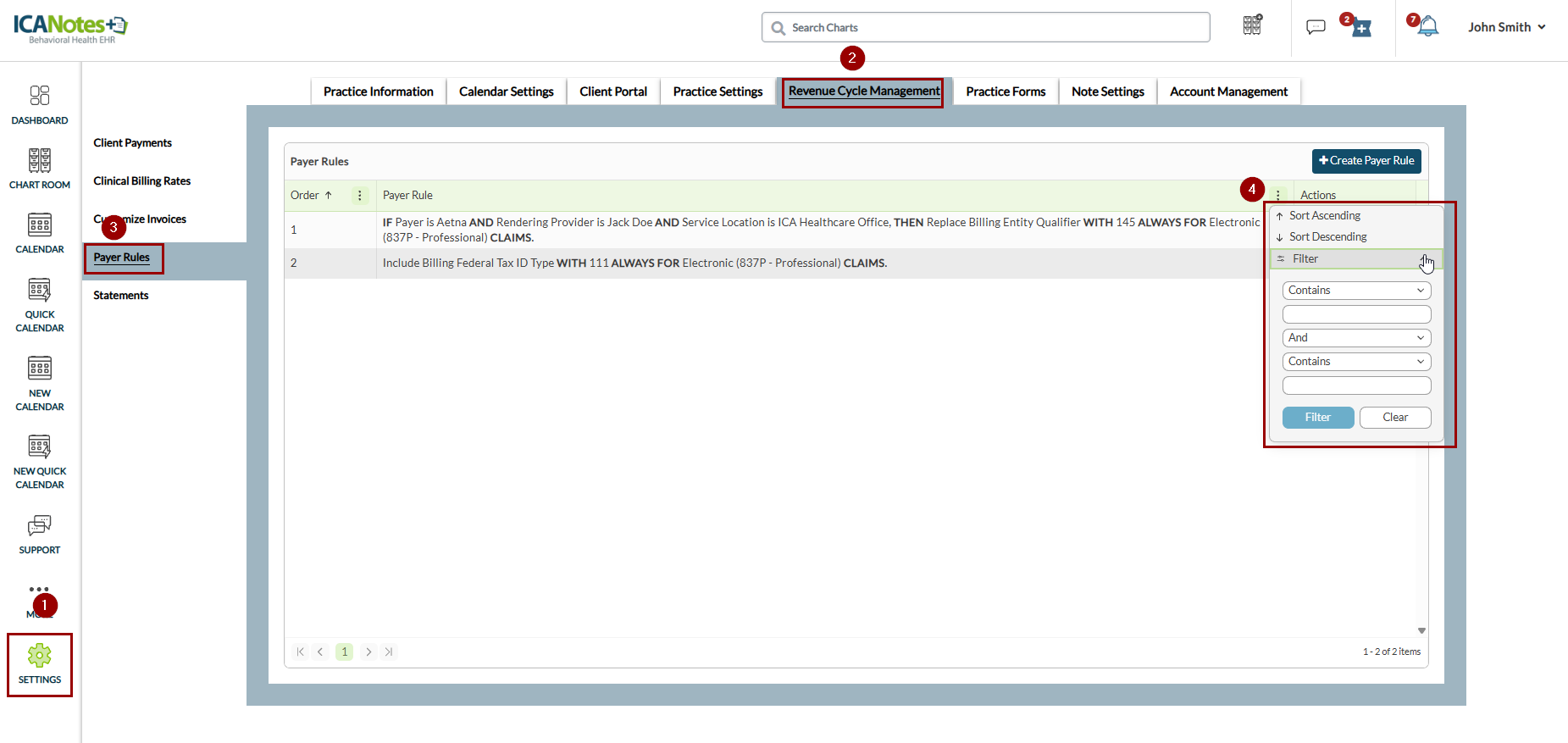ICANotes+ empowers billers to manage payer rules, allowing users to handle custom business rules for their practice with greater ease and flexibility. This feature allows users to define and manage the specific rules required by payers for proper claim processing, ensuring compliance and improving the success rate of claim submissions.