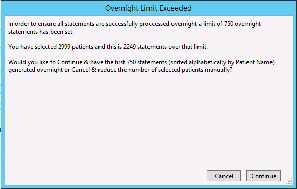 In order to ensure all statements are successfully processed, a limit of 750 statements has been set when generating batch statements overnight. If the limit is not exceeded when generating the batch, you will not see any prompt. However if the number of statements to be generated offline exceeds 750, you will receive a dialog box giving you the option to cancel and reduce the number of statements to be generated, or continue with only the first 750 statements being generated.