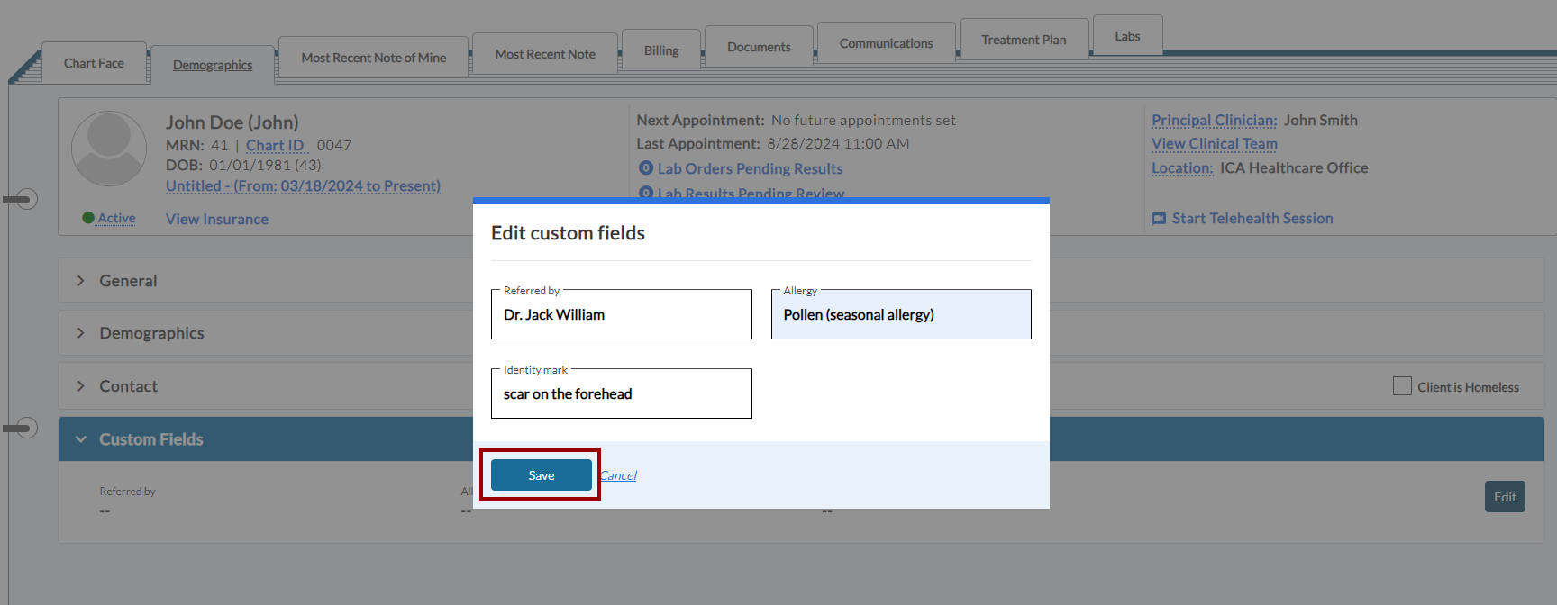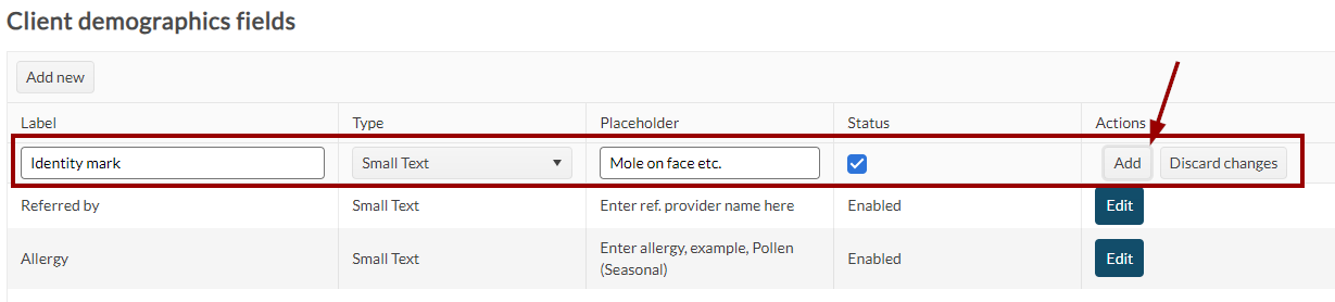 Once custom fields are configured, you can record details for clients in the demographics section.