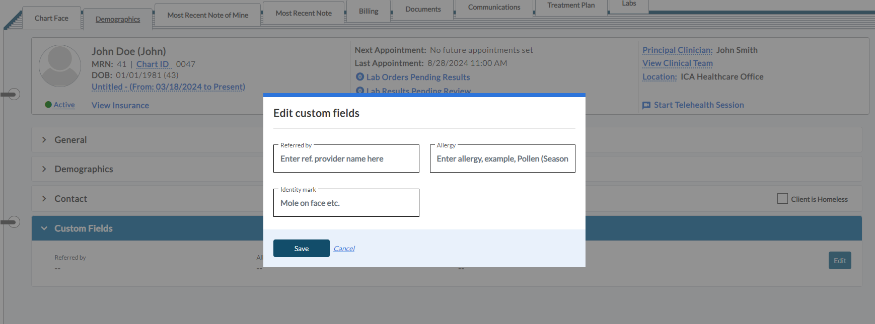 In ICANotes+, when you enter client information, fields like First Name, Last Name, Date of Birth (DOB), Sex, and many more are available. However, if you need to capture additional details (e.g., identification marks) that are not part of the standard fields, the Custom Demographics feature allows you to add them. With this feature, you can configure fields that are not available by default. Once set up, the Custom Fields panel will appear in the demographics section for entering those details.