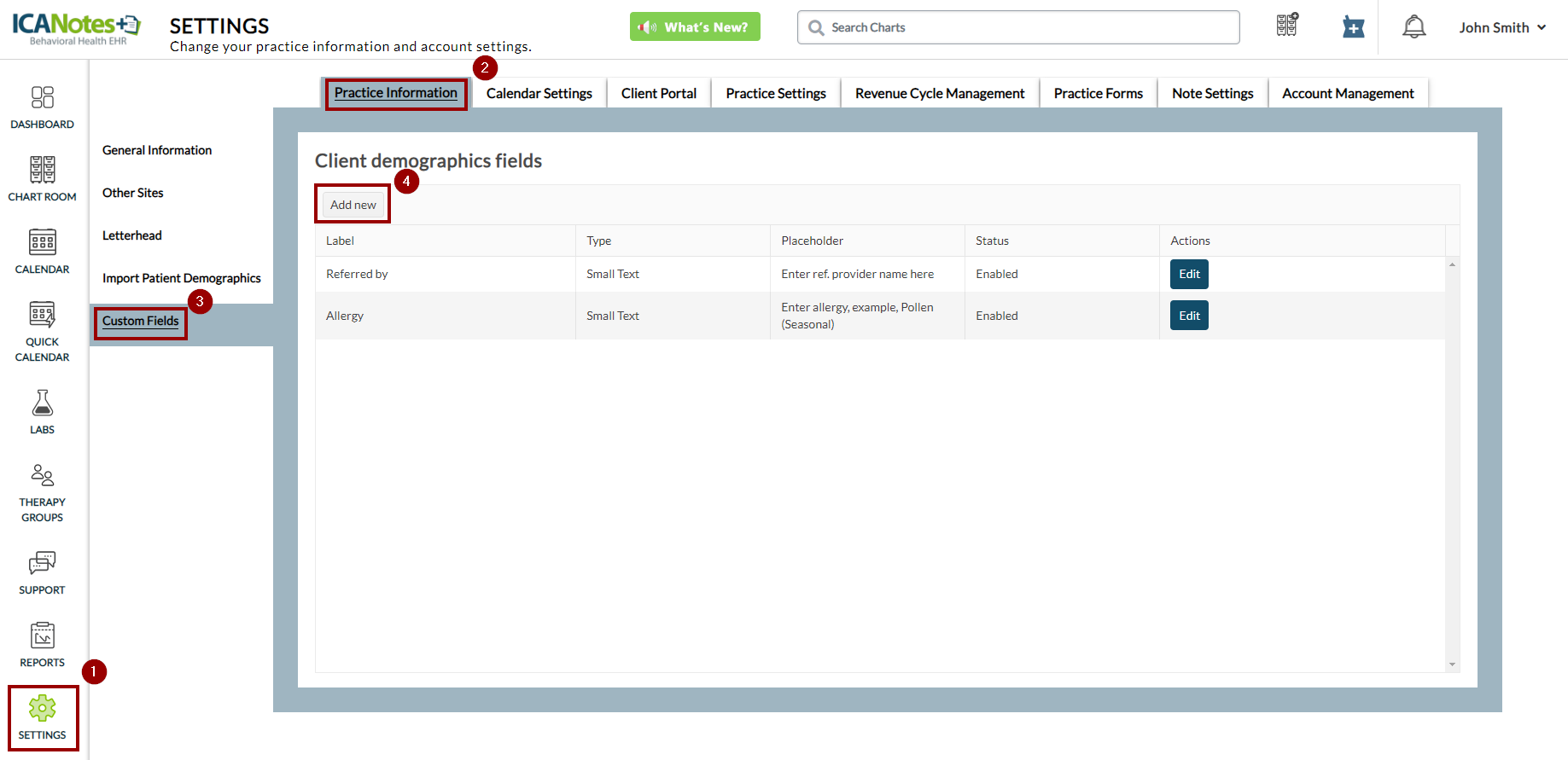 Navigate to Settings > Practice Information > Custom Fields. You will see the configured custom fields. To add a new one, click Add New.