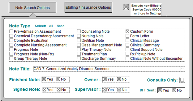 Search functionality within the New Style Billing/Productivity Report now includes the ability to specify custom forms as a search criterion. When ‘Custom Form’ is selected from Note Search Options, an additional dropdown box will appear, allowing for a specific form to be selected. Additionally, new export options have been added for forms that track scores to export Form Score and Composite Form Score. This Knowledge Base article will guide through the workflow of searching for a custom form in the Billing/Productivity report, exporting with the new options, and a list of qualifying score-tracking forms.