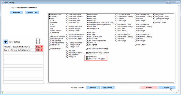 In the Export Settings popover, two new options have been added: Form Score and Composite Form Score. Check one or both as needed, as well as any additional data fields to include. When ready, click Export.