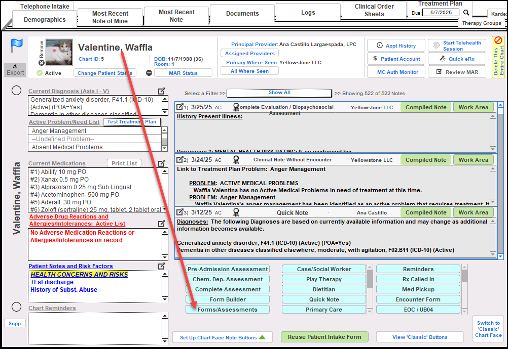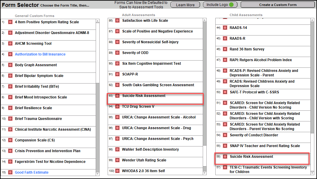 A new Custom Form may be started by clicking on from a patient's Chart Face. Next you'll see the Form Selector, itemized by General/Custom Forms, Adult Assessments, and Child Assessments. When you find the form you want to complete, click the to the ...