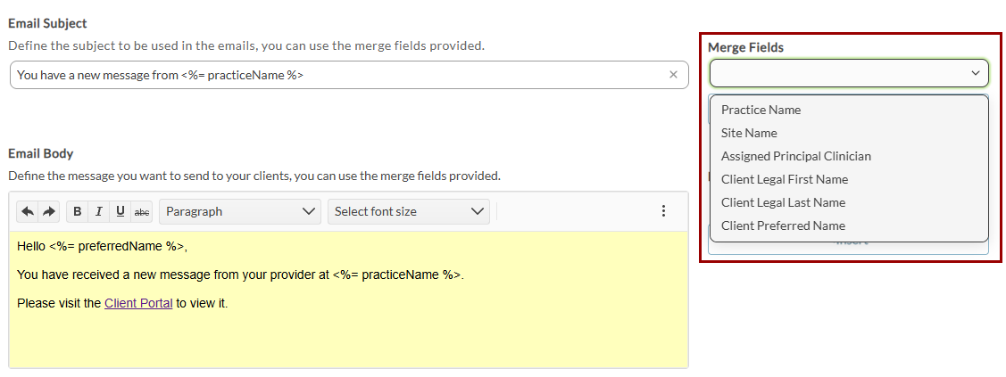 Email Body: The message content sent to clients. Use the editor to format the text and include merge fields to personalize the message.