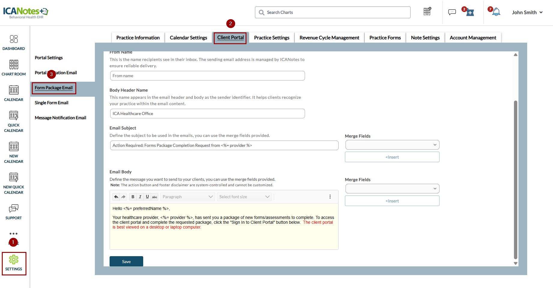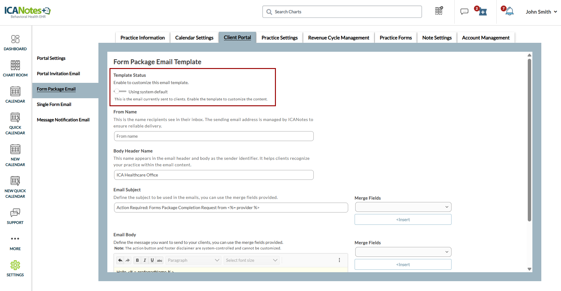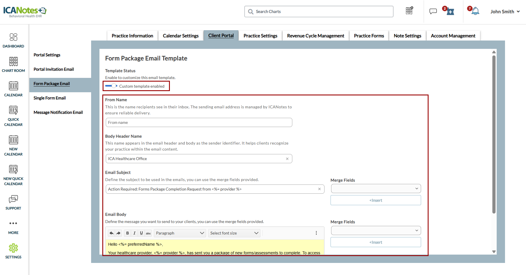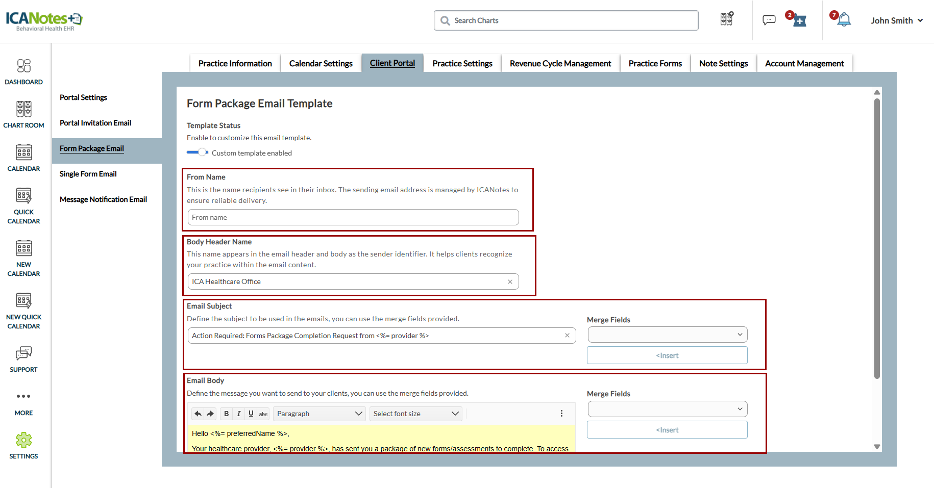 This article explains how to customize the email sent to clients when a provider sends a package of forms or assessments. It describes how to modify the email subject and message content, use available merge fields to personalize the communication, and ensure the email reflects practice-specific preferences before it is sent.