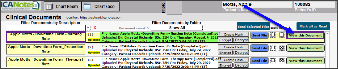 When the downtime has subsided you can see the uploaded note in your patient's Chart.
