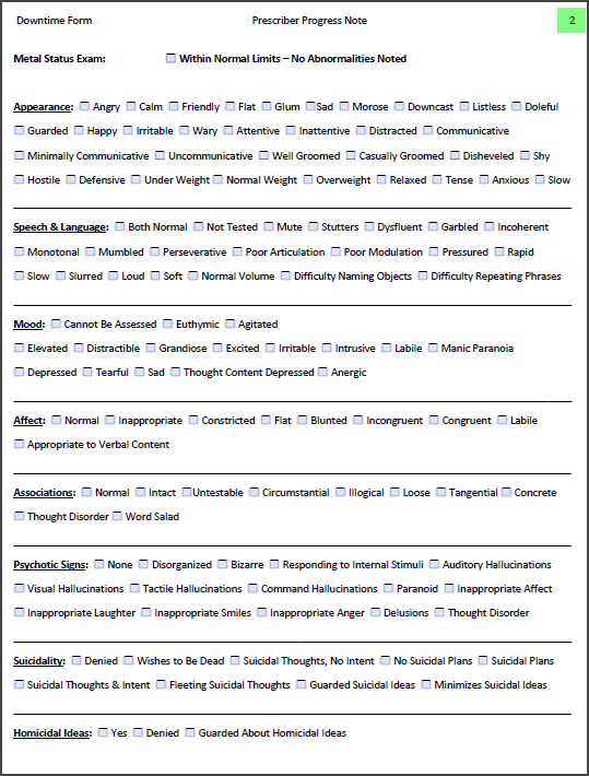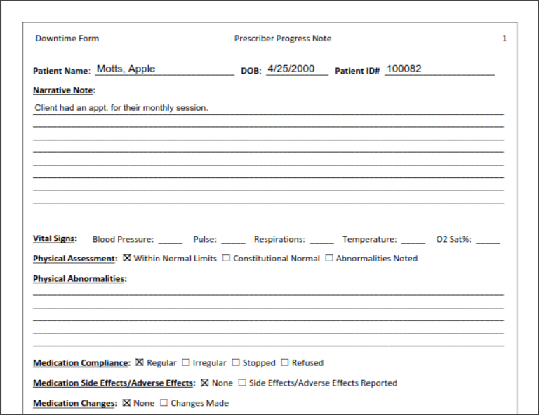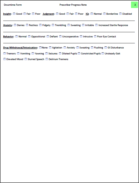 The Downtime Form consists of 3 pages, they contain the sections you are able to document in a Prescriber Note such as, 'Vital Signs', 'Medication Compliance', 'Medication Change', 'Mental Status Exam', etc.