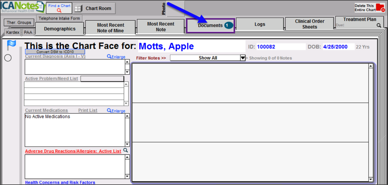 When you've been notified that the system is back up. Login to your ICANotes account, search for your Client's/Patient's chart via the 'Chart Room' and once you're in their 'Chart Face', click