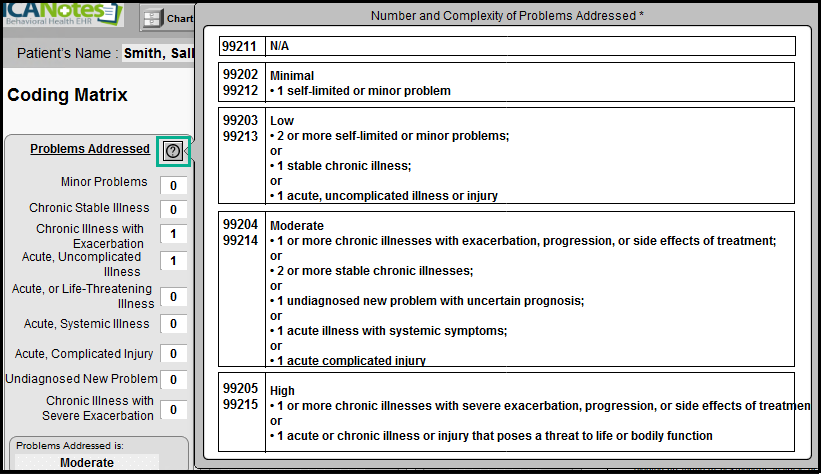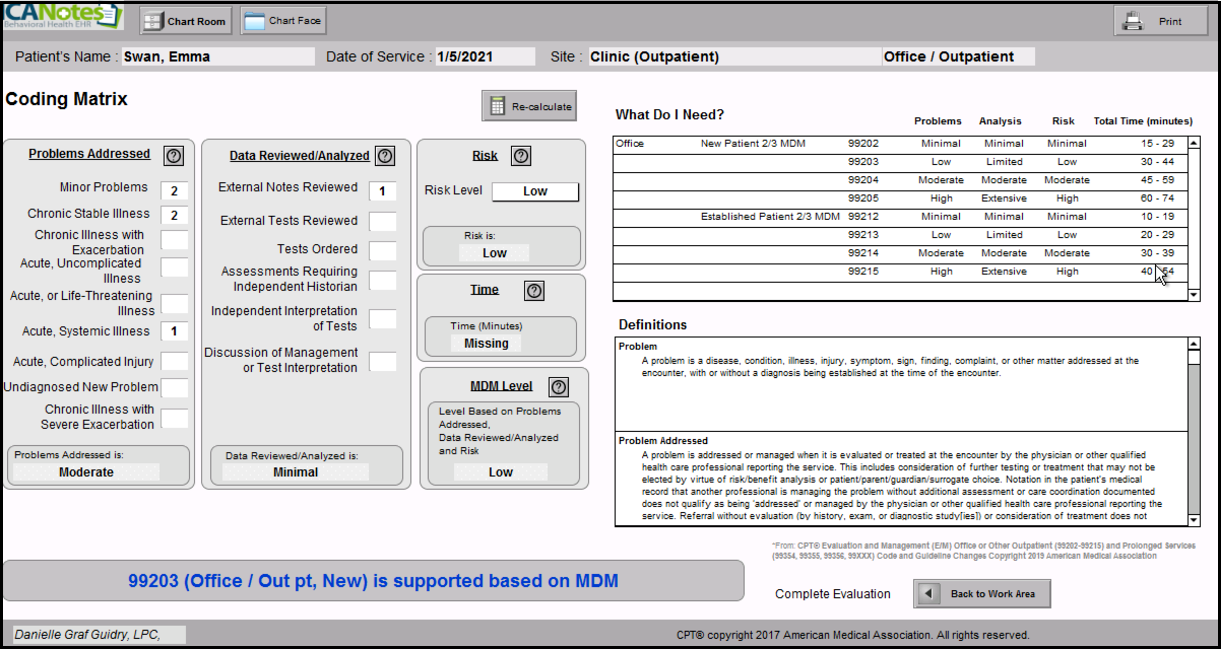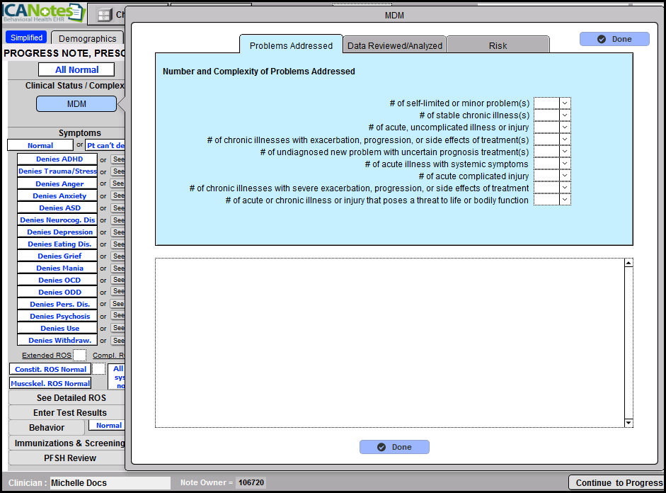 The MDM and Total Minutes Spent fields will dictate your scoring on the new coding Matrix for outpatient facilities. Clinical Status/Complexity is now accessed within the MDM or Medical Decision Making Button.