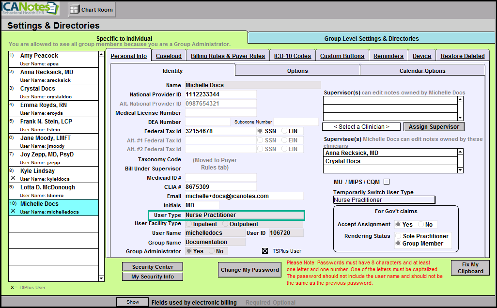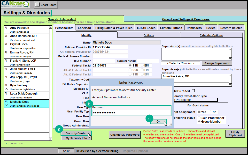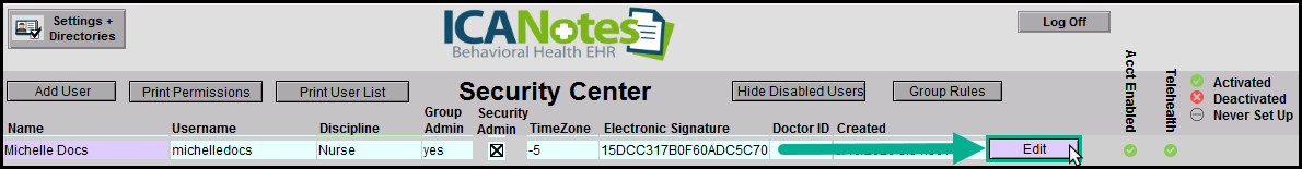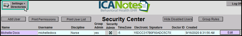 The ICANotes Security Center is available to users designated as Security Administrators for their group. 1. To access the Security Center, go to 'Settings + Directories' from the Chart Room. 2. Click the 'Security Center' button at the bottom. 3. ...