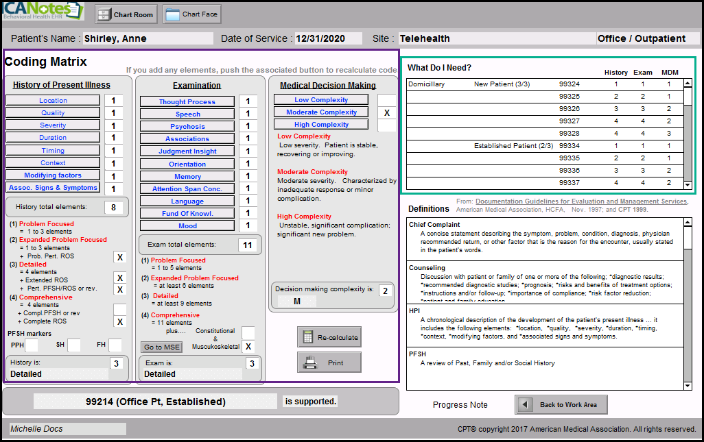 You can view the Coding Matrix to see what elements are required for scoring. The What Do I Need? section at the right will show you the required scoring elements each for History, Exam, and Medical Decision Making based on the level of service. To the left, you will see which elements the program gave you points for and will calculate a score at the bottom of each column.