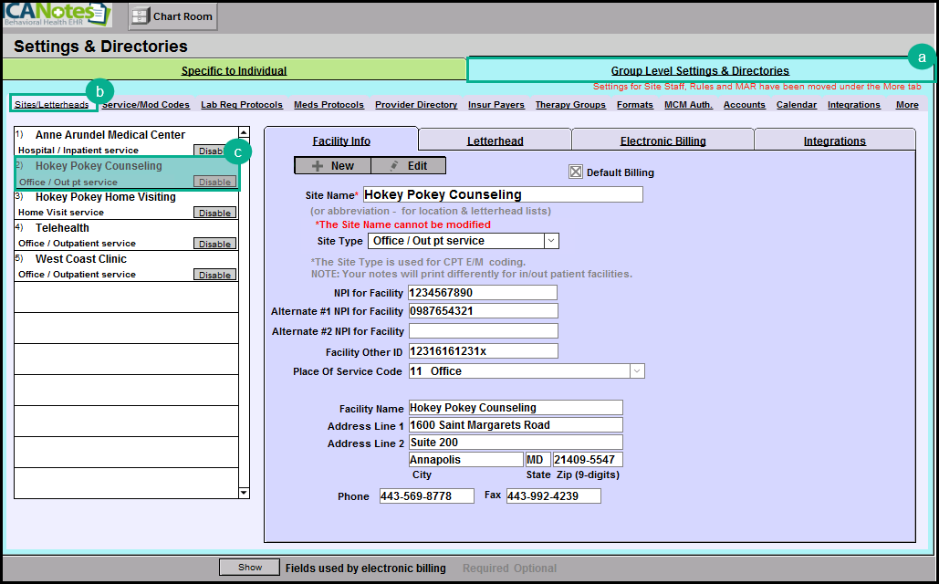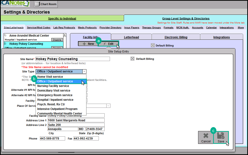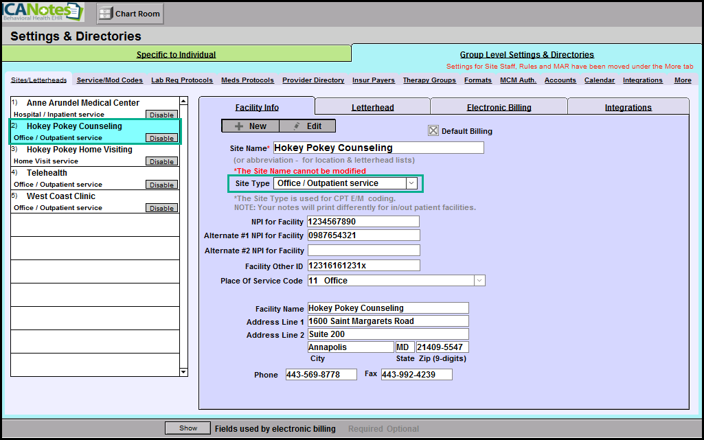 The updated Site Type will be displayed in the Site Listing on the left and on the Facility Info subtab.