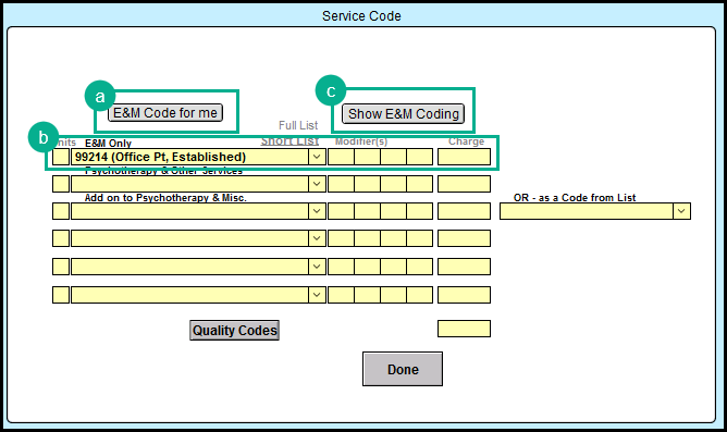 Click on the 'E&M Code For Me' button and the program will determine the highest reimbursable service code based on the content of your note