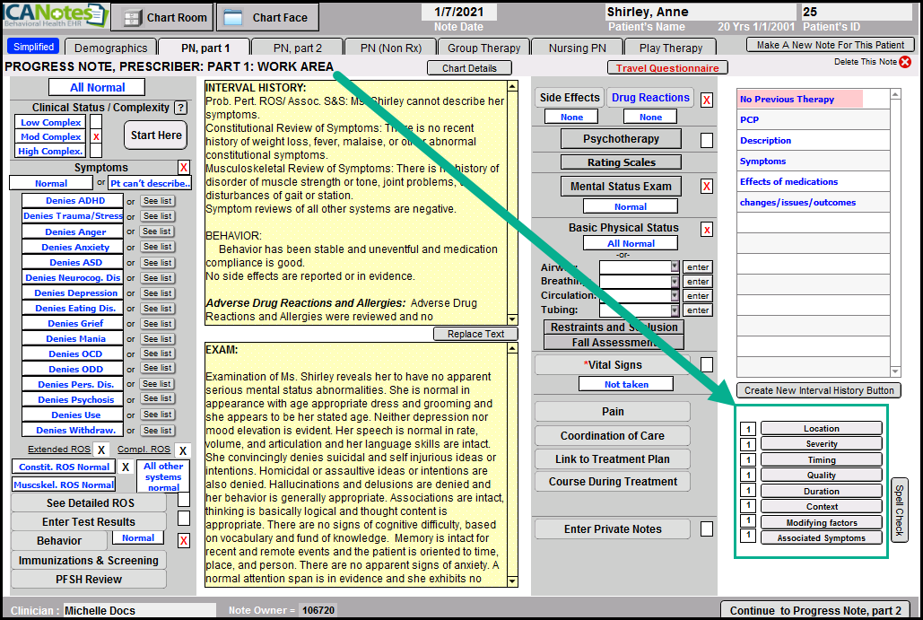 Clinicians may use custom buttons or free-text into the yellow text area in order to complete their note without using the ICANotes shrub content. However, free-texted entries may not trigger the points allotted for that clinical documentation. In that case, the clinician may give themselves credit by clicking on the appropriate button, such as Location, Duration, etc. The clinician is responsible for any points they assign themselves and must ensure they have that information within the note itself.