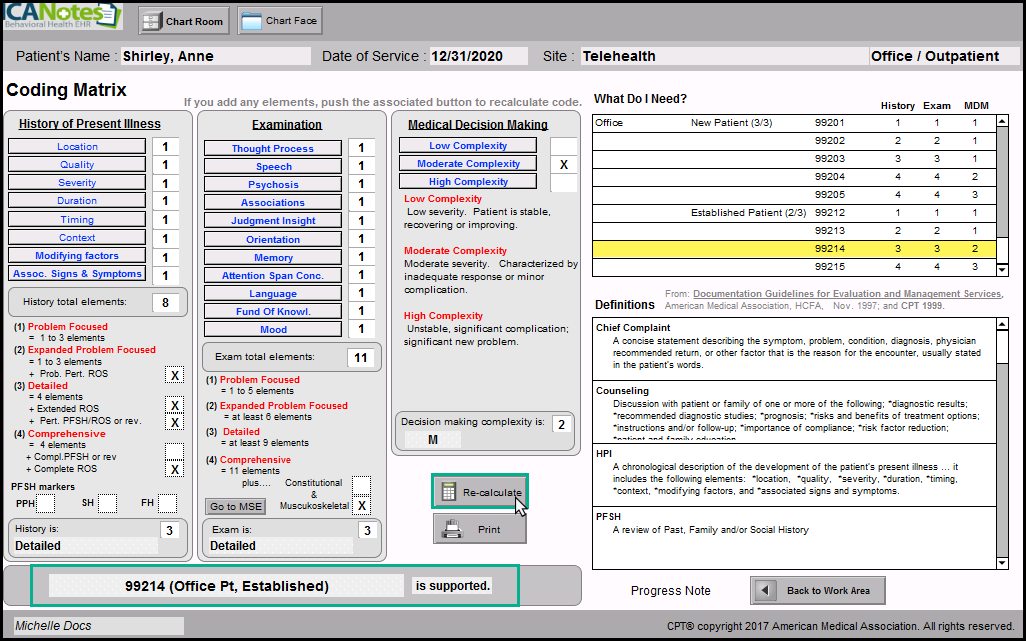If you’ve made manual corrections to the coding matrix by self-scoring your note’s content, click the 'Re-Calculate' button and the system will re-calculate the service code score.