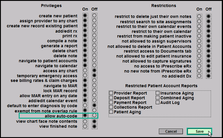 In the Privileges column, click the radio button to set ‘allow auto-code’ to ON, then click to save.