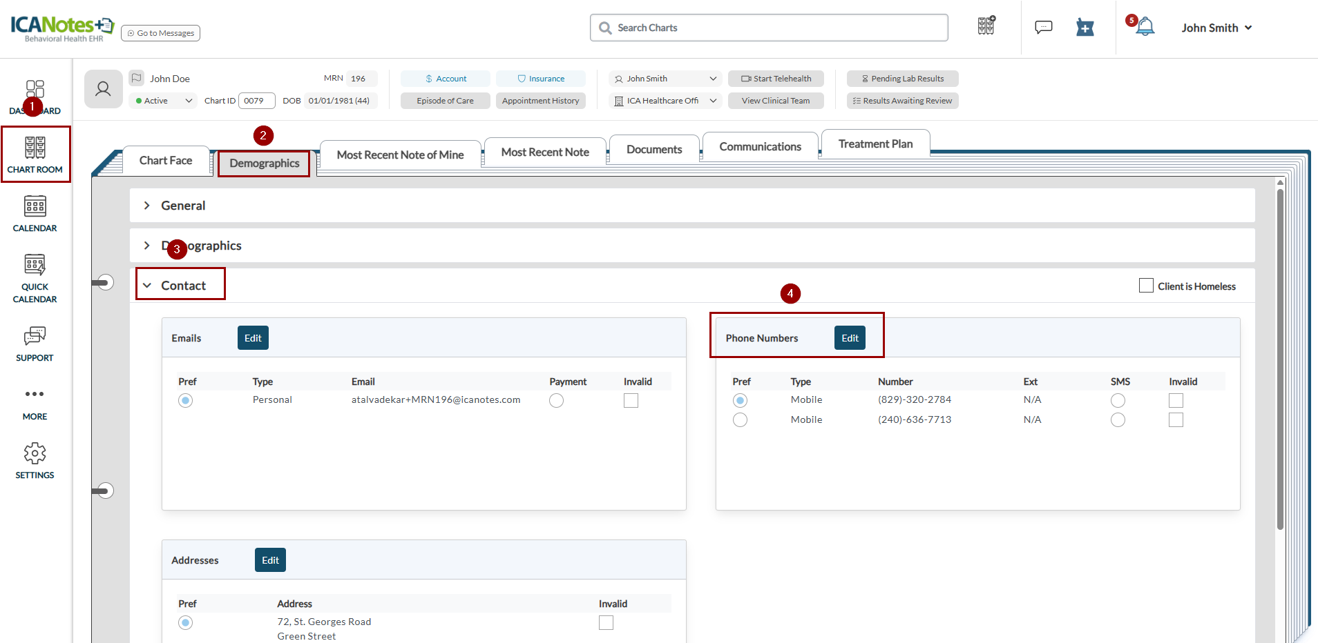 Navigate to Chart Room > Demographics > Contact > Phone Numbers.