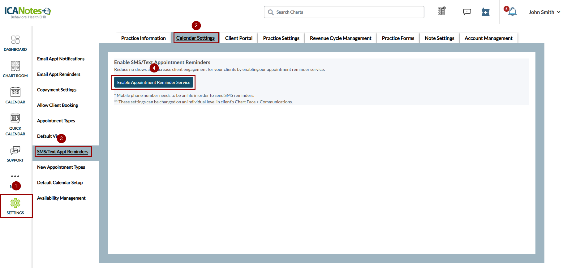 Navigate to Settings > Calendar Settings > SMS/Text Appt Reminders.