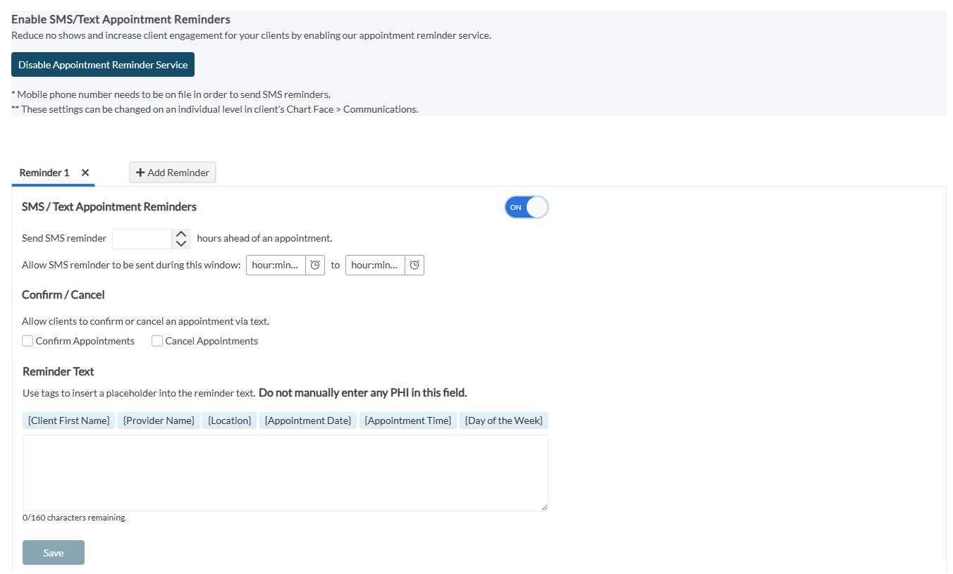 SMS/Text Appointment Reminder Toggle – Use this switch to turn reminders on or off for the selected tab. When turned off, no message is sent for that reminder, even if other reminders are turned on.