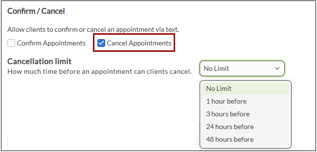 Cancellation limit – Select the number of hours before the appointment that clients are allowed to cancel. After this period, cancellations will not be permitted. This setting is optional — select No limit from the dropdown if you don’t want to set a cancellation limit.