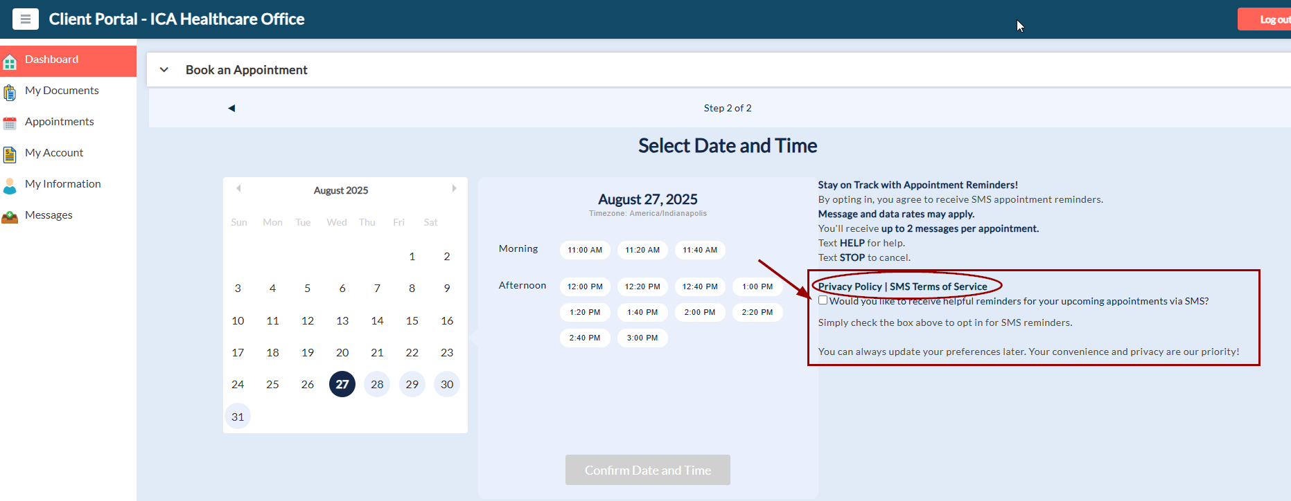 Clients can opt in for SMS reminders when booking an appointment. A link to the privacy policy is provided before they select the opt-in checkbox.
