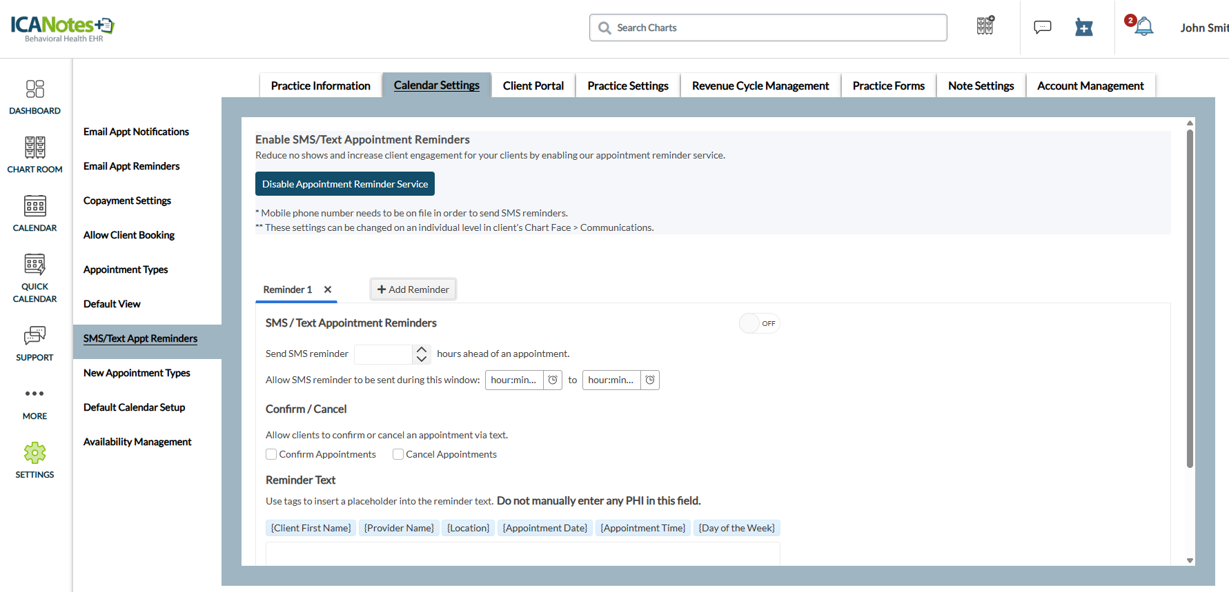 SMS/Text Appointment Reminder Toggle: Use this switch to turn reminders on or off for the selected tab. When turned off, no message is sent for that reminder, even if other reminders are turned on.