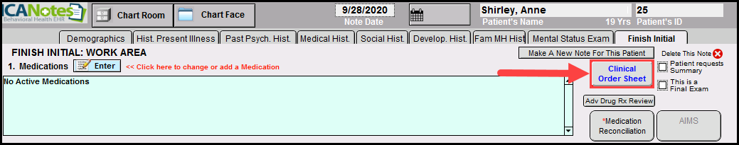 1. On the Complete Assessment, go to the last tab (Finish Initial) and click the 'Clinical Order Sheet' button. It will only be visible in the Complete Assessment to users with clinical disciplines (Psychologist, Nurse Practitioner, Nurse, etc)