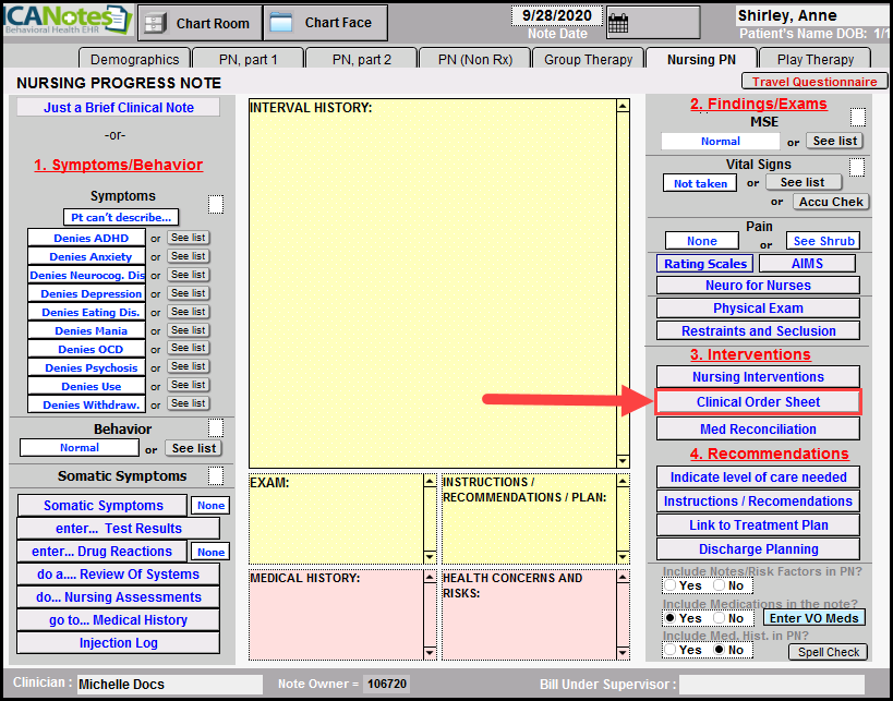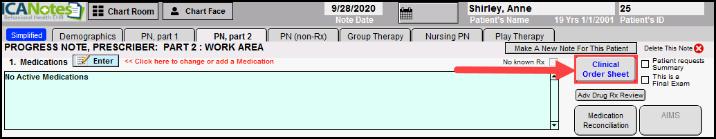 On the Prescriber Progress Note, go to PN, part 2 tab and click the 'Clinical Order Sheet' button.