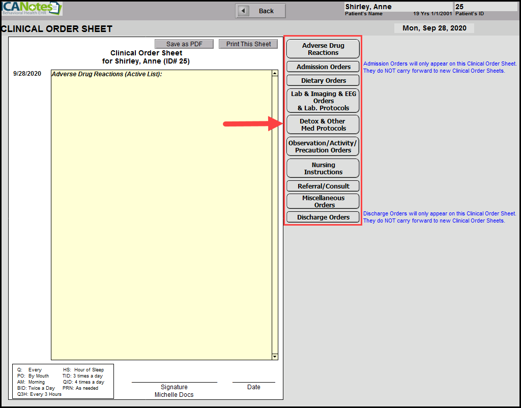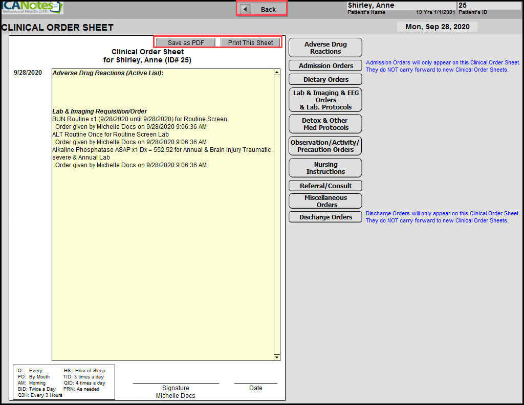 3. Once the clinical order has been entered and saved to the chart, you'll be returned to the Clinical Order Sheet where you can view the orders entered, save them as a PDF, or print them, before returning to the note work areas.