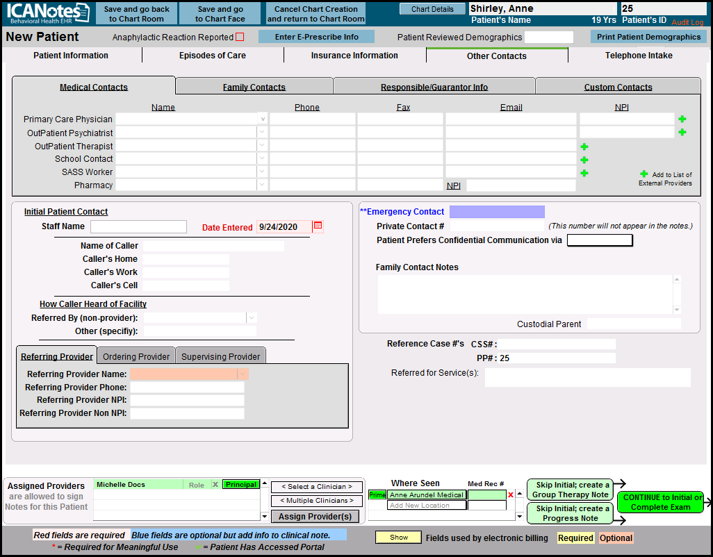 2. 'Continue to Initial or Complete Exam'. Skip Initial; create a Group Therapy Note' and Skip Initial; create a Progress Note' will all take the user to the respective note type after saving the Demographic Information.