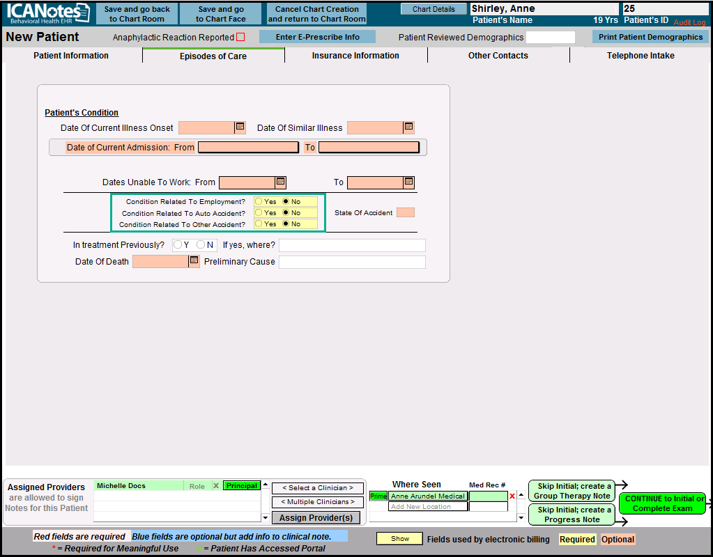 This is used generally for inpatient treatment. There are three yellow fields that should be addressed. Default is "No" to all answers.