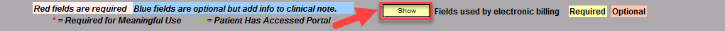 If your practice will be billing electronically, using the 'Show' button to highlight fields used by electronic billing will be helpful. This button is at the bottom of the Demographics Page.