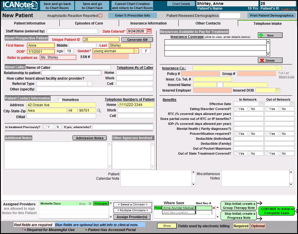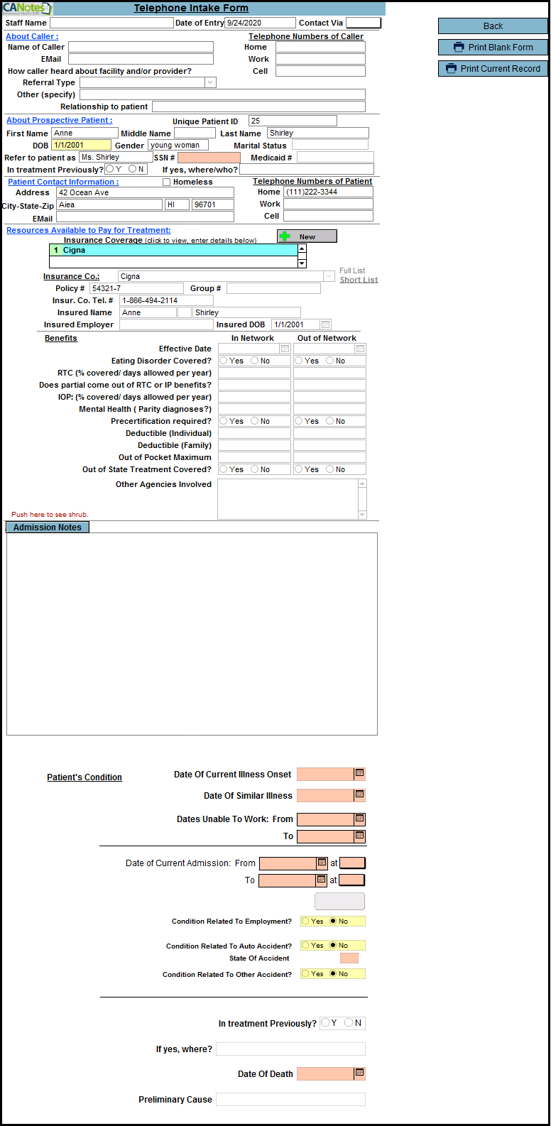 After the initial save, the Telephone Intake Form looks like this, and can be printed.