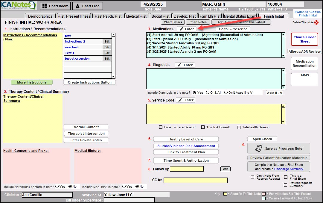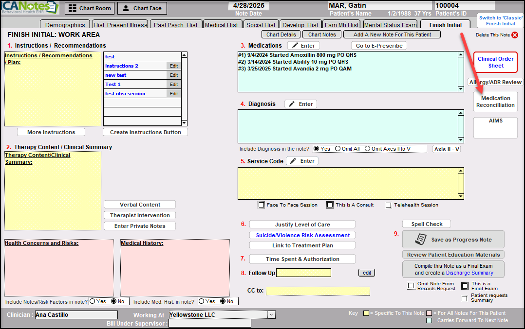 1. If you are seeing the patient for an admission, on the Finish Initial tab click the Medication Reconciliation button to apply any medications that the patient is currently taking.