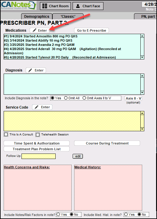 1. Within the Prescriber Progress Note from the PN part 2 tab go to Medications by clicking the Enter button.