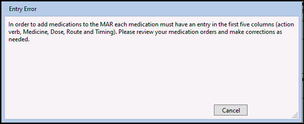 2. When you continue or continue but change, be sure to fill in the fields: Order/verb, Medicine, Dose, Route, and Timing. You will receive an error message if you miss one of these five fields.
