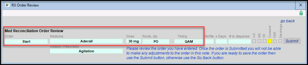 2. Be sure to fill in the fields: Medication Direction, Medicine, Dose, Route, and Timing. You will receive an error message if you miss one of these five fields. You can also include additional optional fields such as # to dispense, X Days, Start Date, and a Comment/Reason.