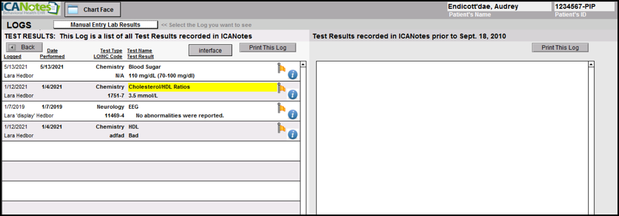 3. Test Results will show. You can mark any abnormal results to show highlighted in yellow by clicking the flag in the row.