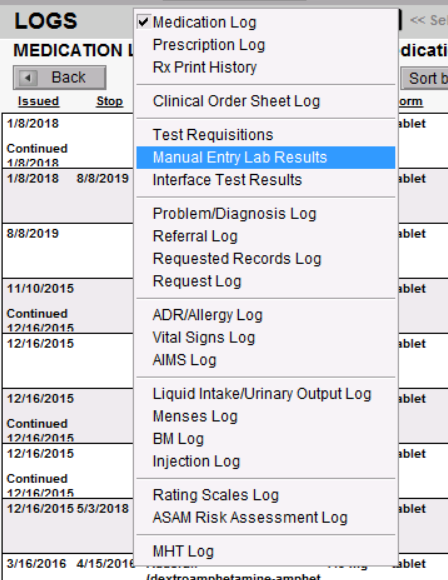 2. Click in the Log selection to get the dropdown menu, and select 'Manual Entry Lab Results'