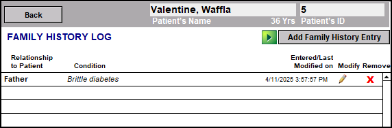 The new entry will be visible within the Family History Log. It can be modified by clicking the pencil icon