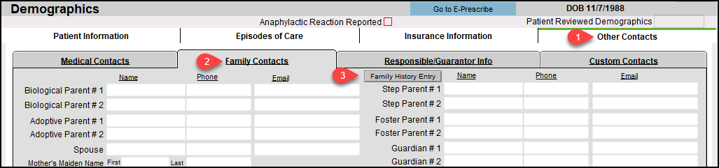 Family History entries can also be made via Demographics without creating a new note. From within Demographics, navigate to the Other Contacts tab, Family Contacts second, and then Family History Entry.
