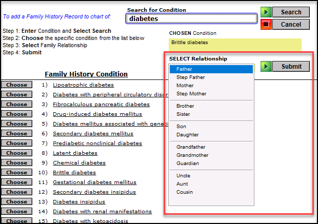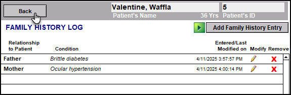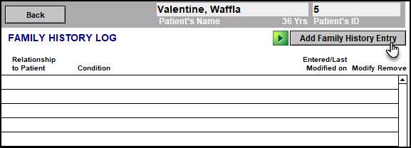 Continue adding in as many entries as necessary, clicking Add Family History Entry each time. When all entries have been made, click Back to return to the work areas of your note.